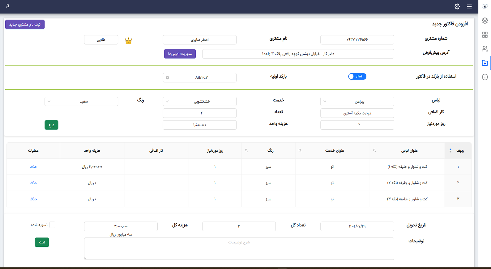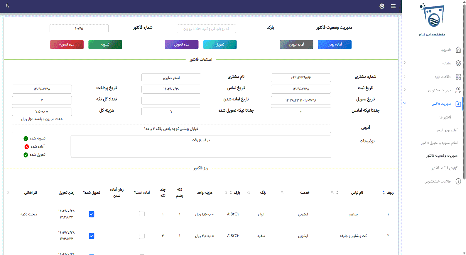 این سامانه تمام فرآیندهای کاری یک خشکشویی مدرن را شامل میشود؛ از ثبت سفارش مشتری، شستوشو و آمادهسازی البسه گرفته تا تحویل نهایی و تسویه حساب، همه در یک بستر هوشمند و یکپارچه.